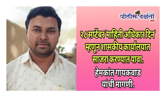 चोपडा | प्रतिनिधी | पोलीस दक्षता लाईव्ह :- दि.२८ सप्टेंबर २०२५ रोजी ‘माहिती अधिकार दिन’ शासकीय कार्यालयात साजरा करण्यात यावा, अशी मागणी स्वराज्य पोलीस मित्र पत्रकार संरक्षण आणि माहिती अधिकार संघटना महाराष्ट्र राज्य तसेच ऑल इंडिया ब्ल्यू टायगर सेनेचे जळगाव जिल्हाध्यक्ष हेमकांत गायकवाड यांनी विभागीय आयुक्त प्रवीण गेडाम (नाशिक विभाग) आणि जिल्हाधिकारी आयुष प्रसाद (जळगाव) यांच्याकडे ई-मेलद्वारे निवेदनाद्वारे केली आहे.