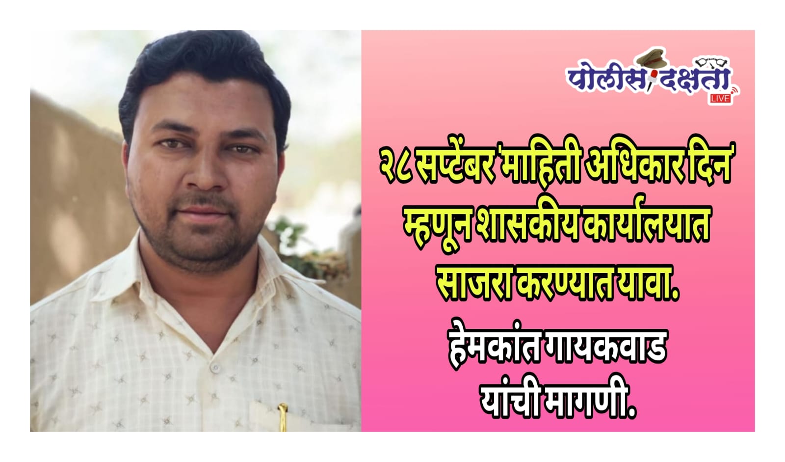 तसेच, या दिनानिमित्त माहिती अधिकार कायद्यावर आधारित उपक्रम राबवून शासकीय अधिकारी-कर्मचारी तसेच सामान्य नागरिकांमध्ये जनजागृती करावी, अशी मागणीही गायकवाड यांनी केली. यामध्ये व्याख्यानमाला, चर्चासत्र, प्रश्नमंजुषा, निबंध, वकृत्व स्पर्धा, माहिती अधिकार कायद्यावर आधारित प्रदर्शन तसेच स्थानिक संस्था व शालेय-महाविद्यालयीन विद्यार्थ्यांचा सहभाग असावा, असेही निवेदनात नमूद करण्यात आले आहे.
