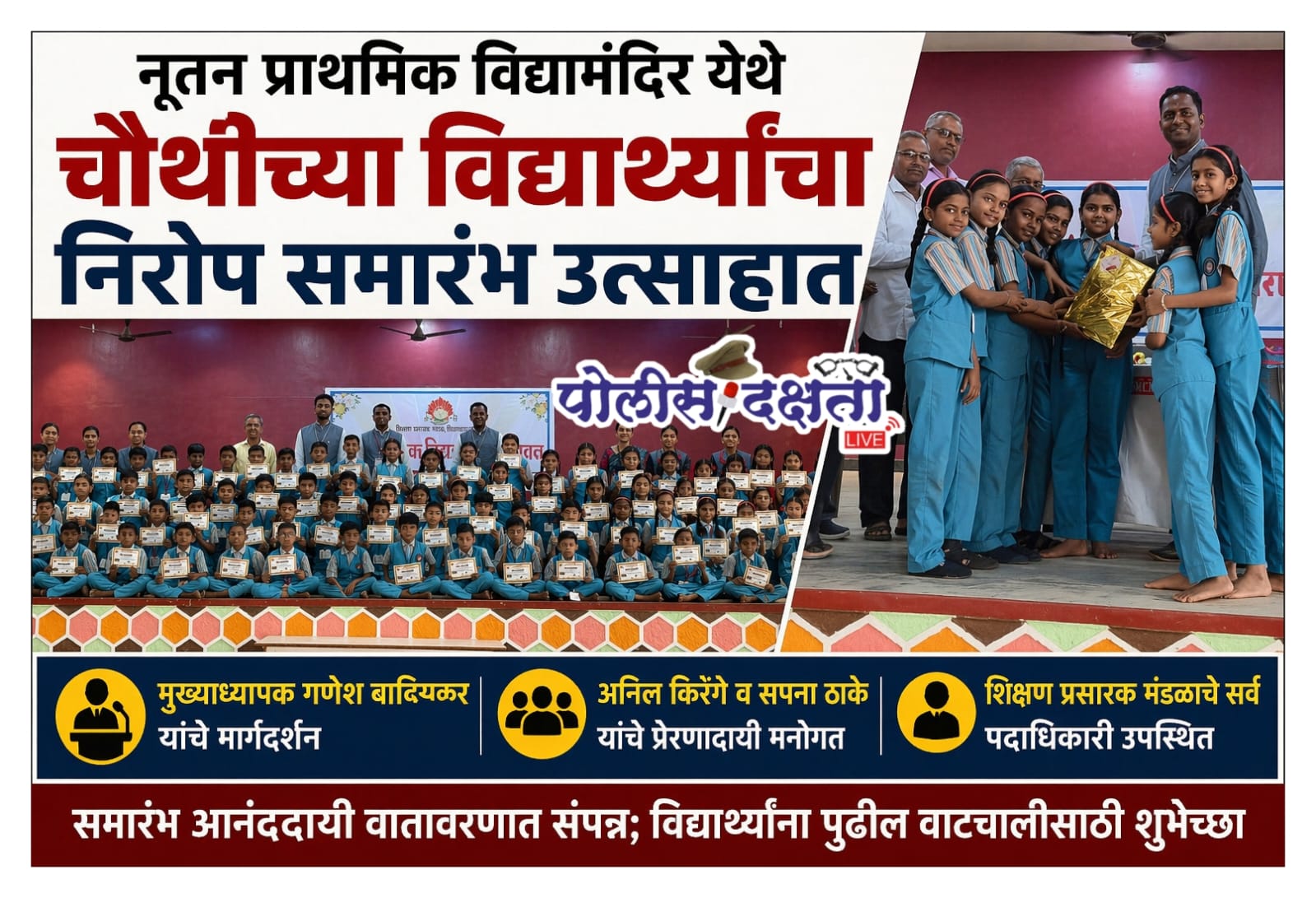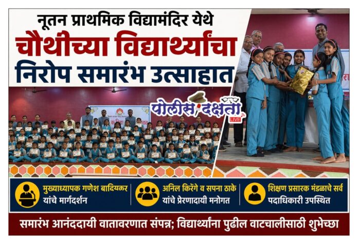 रावेर (चिनावल) | प्रतिनिधी | पोलीस दक्षता लाईव्ह :- नूतन प्राथमिक विद्यामंदिर येथे इयत्ता चौथीच्या विद्यार्थ्यांसाठी निरोप समारंभ उत्साहपूर्ण वातावरणात आयोजित करण्यात आला. कार्यक्रमाची सुरुवात मुख्याध्यापक गणेश बाविस्कर यांच्या प्रास्ताविकाने झाली. त्यांनी विद्यार्थ्यांना पुढील शैक्षणिक वाटचालीसाठी शुभेच्छा देत मोलाचे मार्गदर्शन केले.