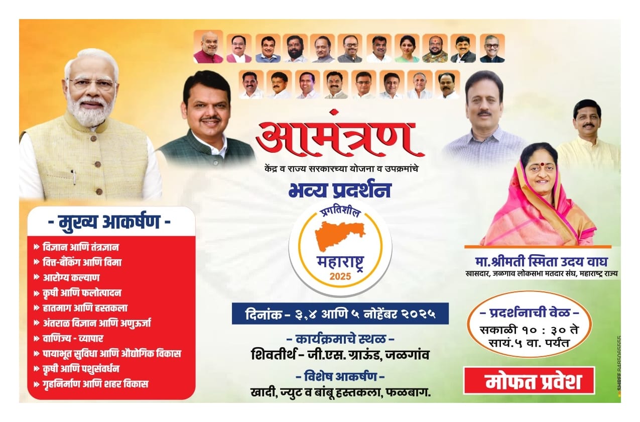 जळगाव | प्रतिनिधी | पोलीस दक्षता लाईव्ह :- जळगाव लोकसभेच्या खासदार सौ. स्मिताताई वाघ यांच्या संकल्पनेतून केंद्र आणि राज्य शासनाच्या विविध योजना, उपक्रम, प्रगती आणि विकासाचे दर्शन घडविणाऱ्या “प्रगतिशील महाराष्ट्र २०२५” या भव्य प्रदर्शनाचे आज दि. ३ नोव्हेंबर सोमवार रोजी सकाळी १०.३० वाजता उद्घाटन होत आहे. हे प्रदर्शन शिवतीर्थ (जी.एस. ग्राउंड), जळगाव येथे ३ ते ५ नोव्हेंबर या कालावधीत आयोजित करण्यात आले असून, नागरिकांसाठी सकाळी १०.०० ते सायंकाळी ५.३० पर्यंत खुले राहणार आहे.