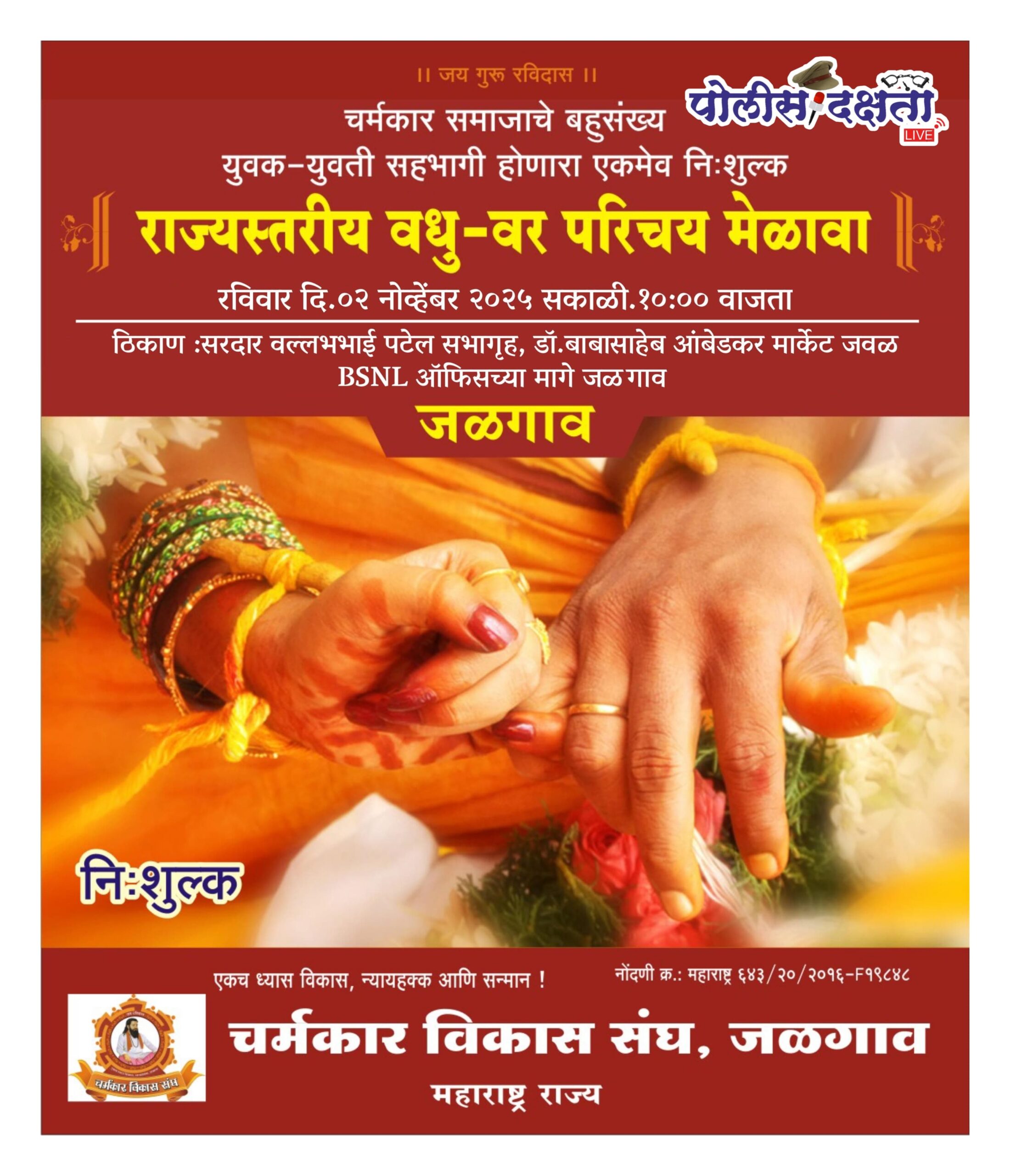 जळगाव | प्रतिनिधी | पोलीस दक्षता लाईव्ह :- चर्मकार समाजातील विवाहइच्छुक युवक-युवती, तसेच पालकांचा वेळ, श्रम आणि पैसा वाचावा व सुयोग्य जोडीदार एकाच व्यासपीठावर उपलब्ध व्हावा, या सामाजिक उद्देशाने जळगाव जिल्हा चर्मकार विकास संघातर्फे तृतीय आंतरराज्यीय वधू-वर परिचय मेळाव्याचे आयोजन रविवार, दिनांक २ नोव्हेंबर २०२५ रोजी सकाळी १० वाजता सरदार वल्लभभाई पटेल सभागृह (लेवा भवन), जळगाव येथे करण्यात आले आहे.