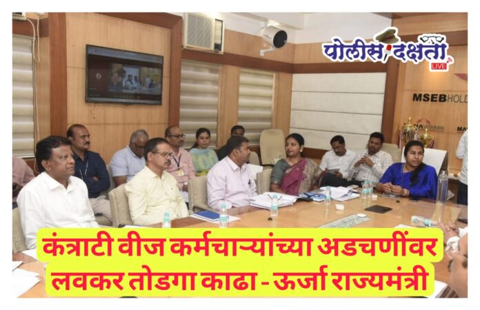 मुंबई | प्रतिनिधी | पोलीस दक्षता लाईव्ह :- राज्यातील महानिर्मिती, महावितरण आणि महापारेषण या वीज कंपन्यांमधील कंत्राटी कामगारांच्या विविध समस्यांचा आढावा ऊर्जा राज्यमंत्री मेघना साकोरे बोर्डीकर यांनी नुकत्याच झालेल्या बैठकीत घेतला. या वेळी कामगारांना भेडसावणाऱ्या अडचणी गांभीर्याने लक्षात घेऊन त्यावर तातडीने प्रभावी उपाययोजना कराव्यात, अशा स्पष्ट सूचना त्यांनी संबंधित अधिकाऱ्यांना दिल्या.