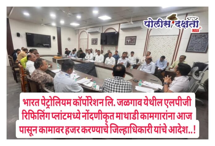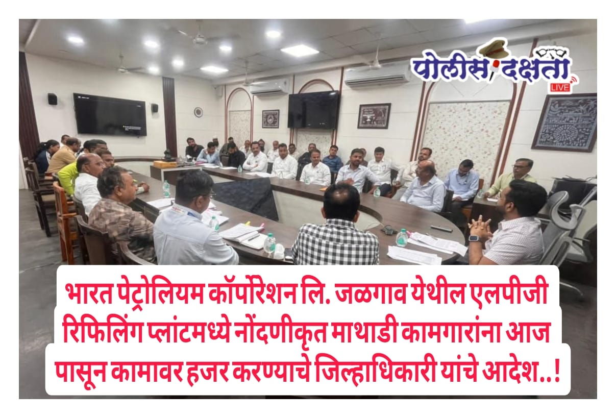 जळगाव | प्रतिनिधी | पोलीस दक्षता लाईव्ह :- भारत पेट्रोलियम कॉर्पोरेशन लि., एम.आय.डी.सी. जळगाव येथील एलपीजी रिफिलिंग प्लांटमध्ये नोंदणीकृत माथाडी कामगारांना ३ डिसेंबरपासून प्रवेश व काम नाकारल्याच्या तक्रारीच्या पार्श्वभूमीवर जिल्हाधिकारी कार्यालयात सोमवारी (८ डिसेंबर २०२५) तातडीची व महत्त्वपूर्ण बैठक घेण्यात आली. उत्तर महाराष्ट्र माथाडी इतर श्रमजीवी असंरक्षित व असंघटीत कामगार संघटनेने संबंधित कामगारांना प्लांटमध्ये येण्यास मज्जाव केल्याची तक्रार जिल्हाधिकाऱ्यांकडे केली होती.बैठकीत परिस्थितीचा सविस्तर आढावा घेत जिल्हाधिकारी यांनी कठोर भूमिकेत स्पष्ट निर्देश दिले की, “निवडणूक दिवशी मतदानासाठी सुट्टी घेतल्याच्या कारणावरून कोणत्याही नोंदणीकृत माथाडी कामगाराला कामावरून दूर ठेवणे अनुचित आहे. सर्व कामगारांना उद्याच्या सकाळच्या शिफ्टपासून तात्काळ कामावर रुजू करून घ्यावे.”