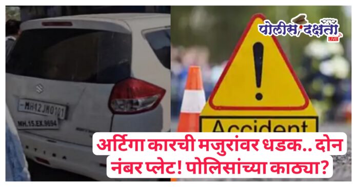 मुक्ताईनगर | प्रतिनिधी | पोलीस दक्षता लाईव्ह : मुंबई–नागपूर महामार्गावरील हरताळा फाटा येथे गुरुवारी सकाळी भीषण अपघात घडला. जळगावकडून मुक्ताईनगरच्या दिशेने येणाऱ्या अर्टिगा कारने रस्त्याच्या कडेला उभ्या असलेल्या चार मजुरांना जोरदार धडक दिल्याने ते गंभीर जखमी झाले. अपघातानंतर कारमधील चालक घटनास्थळावरून फरार झाला असून कारला दोन नंबर प्लेट लावण्यात आल्याचे उघड झाल्याने परिसरात खळबळ उडाली आहे.
