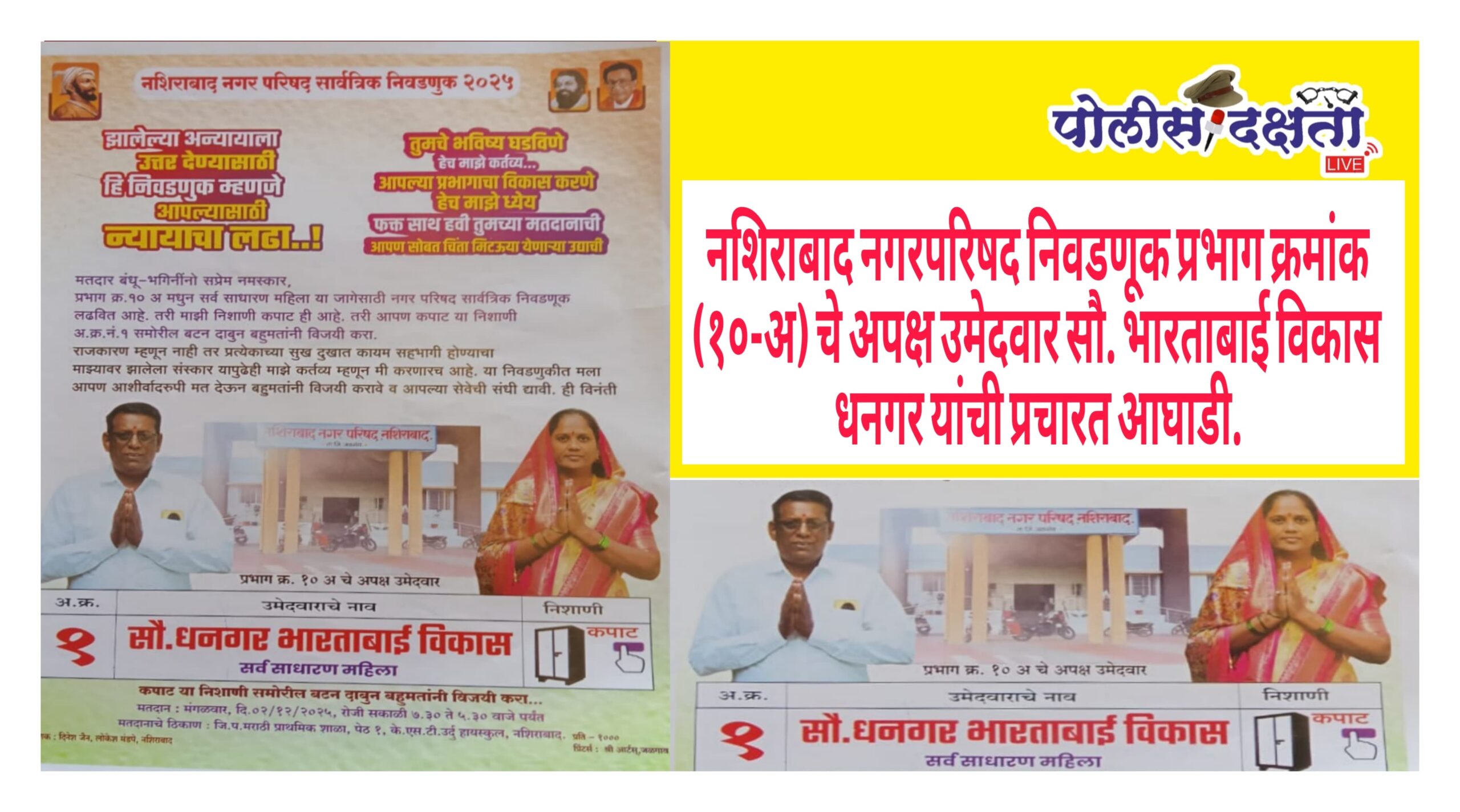 नशिराबाद | प्रतिनिधी | पोलीस दक्षता लाईव्ह :- नशिराबाद नगरपरिषद निवडणुकीत प्रभाग क्रमांक (१० अ) मधून उमेदवारी दाखल केलेल्या भारताबाई विकास धनगर यांच्या प्रचाराला दिवसेंदिवस भरघोस गती मिळत आहे. स्थानिक पातळीवर त्यांच्याबद्दल सकारात्मक वातावरण तयार झाल्याचे चित्र स्पष्टपणे उमटत असून प्रभागभर त्यांची चर्चा रंगत आहे.राजकीय क्षेत्रात दीर्घकाळ कार्यरत राहिलेले शिवसेनेचे माजी शहराध्यक्ष विकास धनगर यांच्या कार्याचा ठसा आणि अनुभवाचा वारसा भारताबाई धनगर यांच्या उमेदवारीला बळकटी देत असल्याचे नागरिकांकडून व्यक्त होत आहे. जनसंपर्काच्या माध्यमातून त्यांनी प्रभागातील समस्यांना भिडून सुटसुटीत उपाययोजना मतदारांसमोर मांडल्या आहेत.