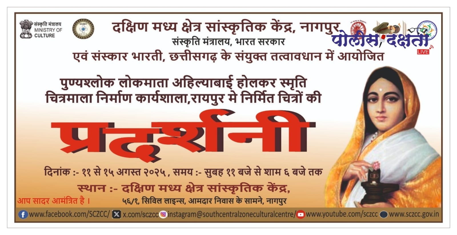 नागपूर | प्रतिनिधी | पोलीस दक्षता लाईव्ह :- दक्षिण मध्य क्षेत्र सांस्कृतिक केंद्र, नागपूर यांच्या वतीने 11 ते 15 ऑगस्ट 2025 दरम्यान ‘पुण्यश्लोक लोकमाता अहिल्याबाई होळकर’ छायाचित्र व चित्रप्रदर्शन आयोजित करण्यात आले आहे. हे प्रदर्शन केंद्राच्या बहुउद्देशीय सभागृहात भरवले जाणार असून दररोज सकाळी 11 ते सायंकाळी 6 या वेळेत नागरिकांसाठी खुले राहील. उद्घाटन समारंभ 11 ऑगस्ट रोजी सकाळी 11 वाजता होणार आहे.