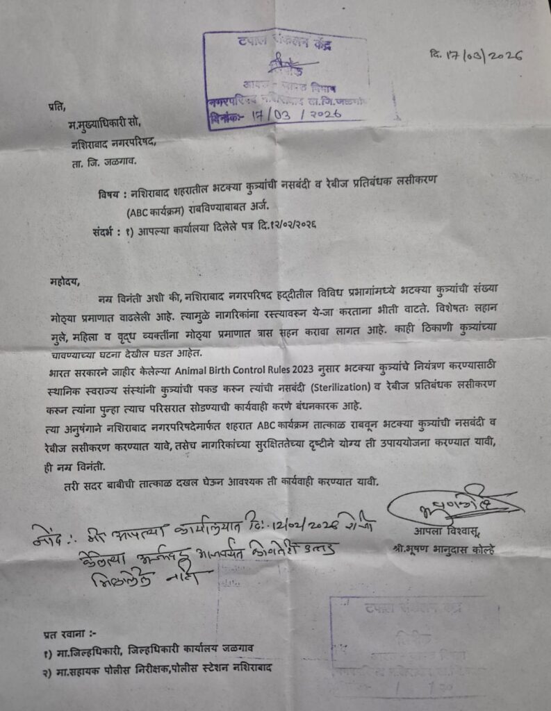 भारत सरकारने जाहीर केलेल्या Animal Birth Control Rules 2023 नुसार भटक्या कुत्र्यांचे नियंत्रण करण्यासाठी स्थानिक स्वराज्य संस्थांनी कुत्र्यांना पकडून त्यांची नसबंदी (Sterilization) व रेबीज प्रतिबंधक लसीकरण करणे बंधनकारक आहे. त्यानंतर त्यांना पुन्हा त्याच परिसरात सोडण्याची प्रक्रिया राबविणे अपेक्षित आहे.या पार्श्वभूमीवर नशिराबाद नगरपरिषदेमार्फत शहरात ABC (Animal Birth Control) कार्यक्रम तात्काळ राबवून भटक्या कुत्र्यांची नसबंदी व लसीकरण करावे, तसेच नागरिकांच्या सुरक्षिततेच्या दृष्टीने आवश्यक ती उपाययोजना करावी, अशी मागणी अर्जात करण्यात आली आहे.