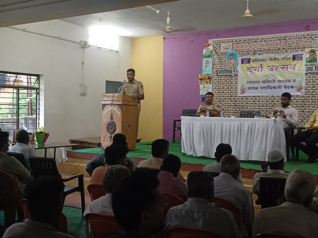 नशिराबाद | प्रतिनिधी | पोलीस दक्षता लाईव्ह :- काल दिनांक २० सप्टेंबर २०२५ रोजी नशिराबाद शहर व परिसरातील दुर्गा उत्सवाच्या पार्श्वभूमीवर उपविभागीय पोलीस अधिकारी संदीप गावित यांच्या अध्यक्षतेखाली सामायिक बैठकीचे आयोजन करण्यात आले. या बैठकीस गणेश मंडळाचे अध्यक्ष व कार्यकर्ते, शांतता समितीचे सदस्य, पोलीस पाटील तसेच पत्रकार यांची उपस्थिती होती.