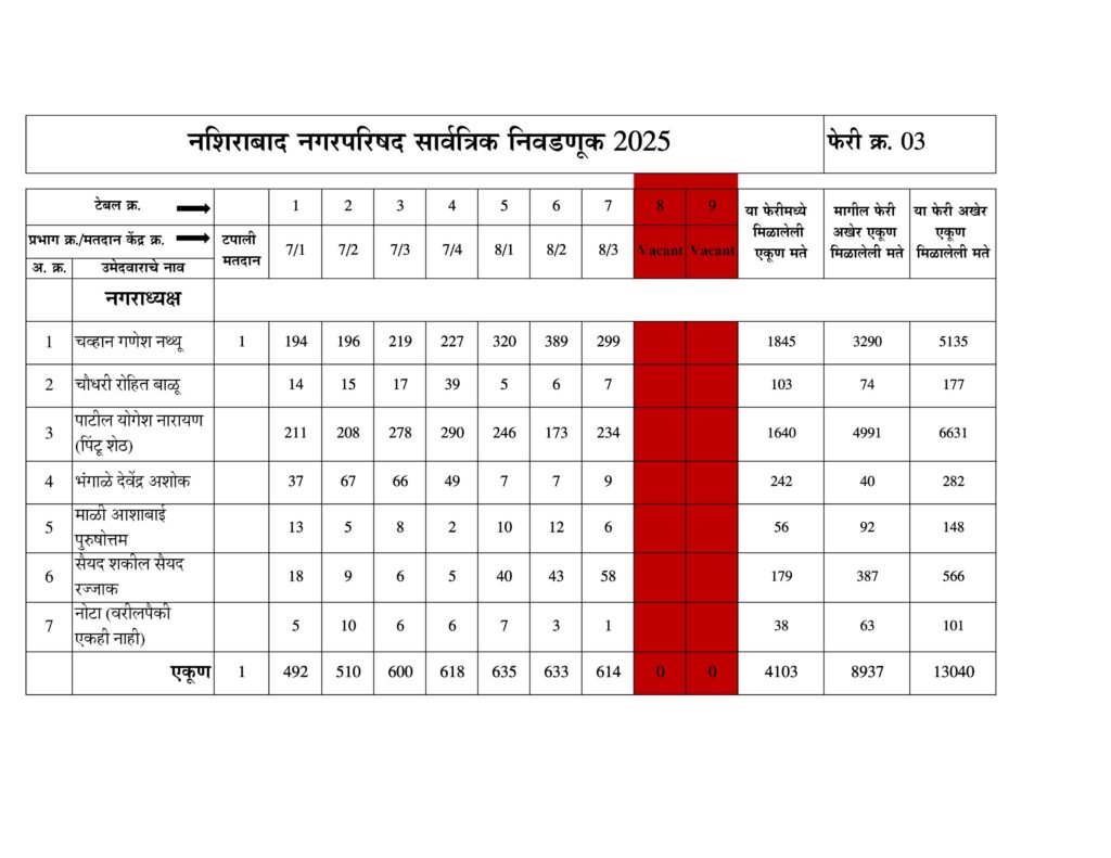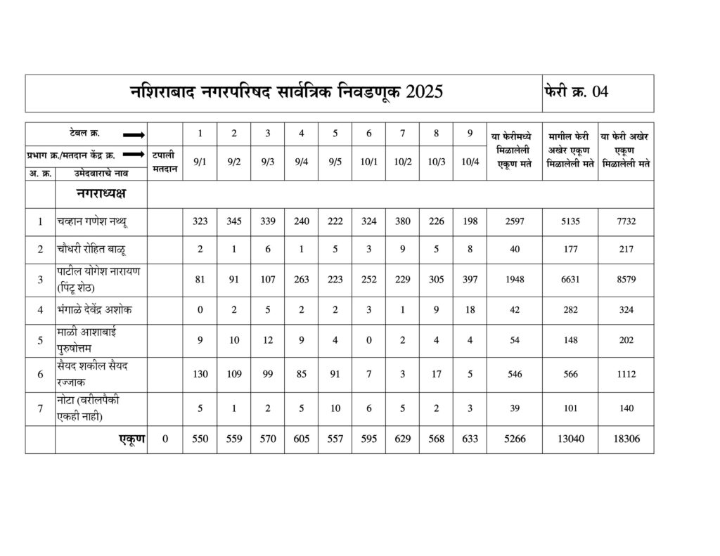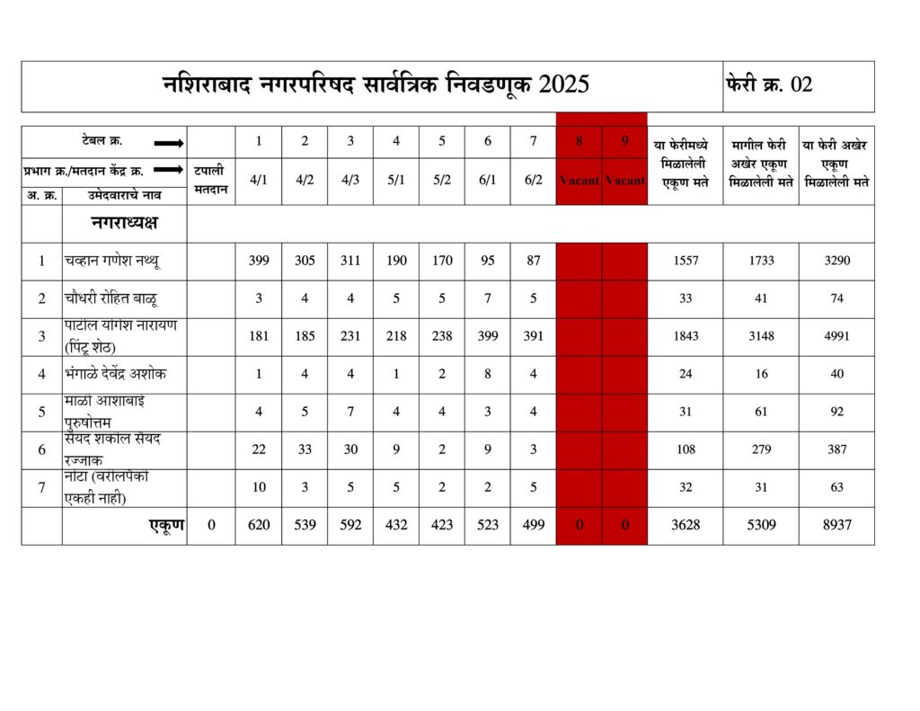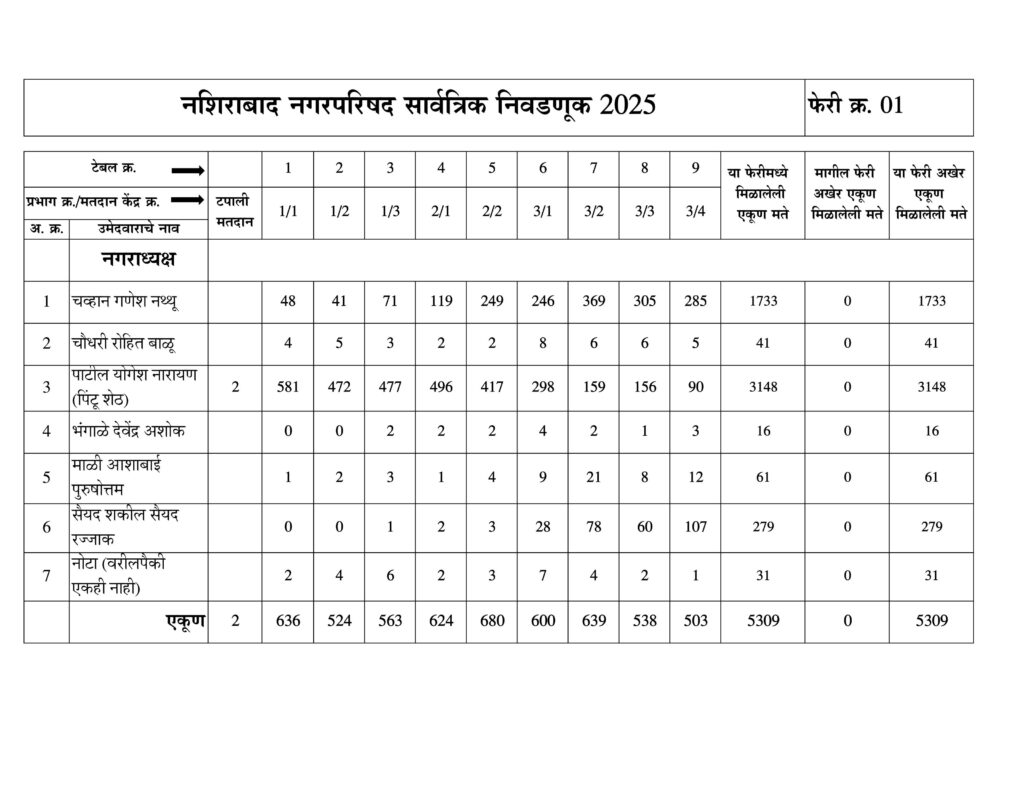 नशिराबाद नगरपरिषद नगराध्यक्ष पदासाठीची मतमोजणी फेरी नुसार:-