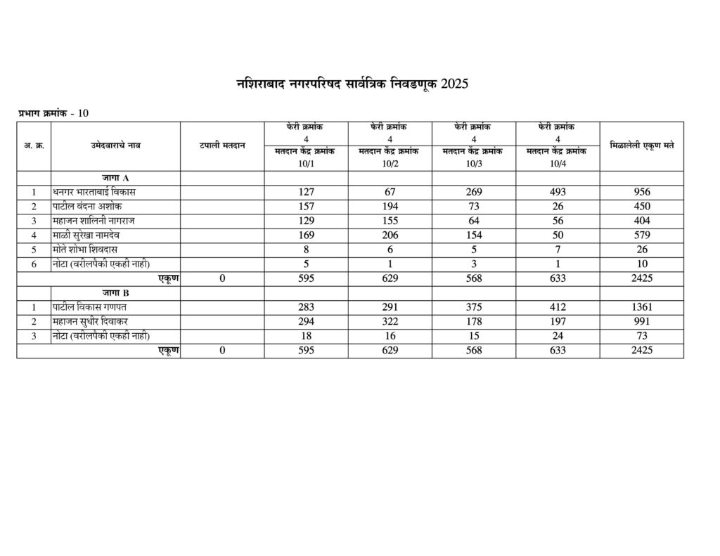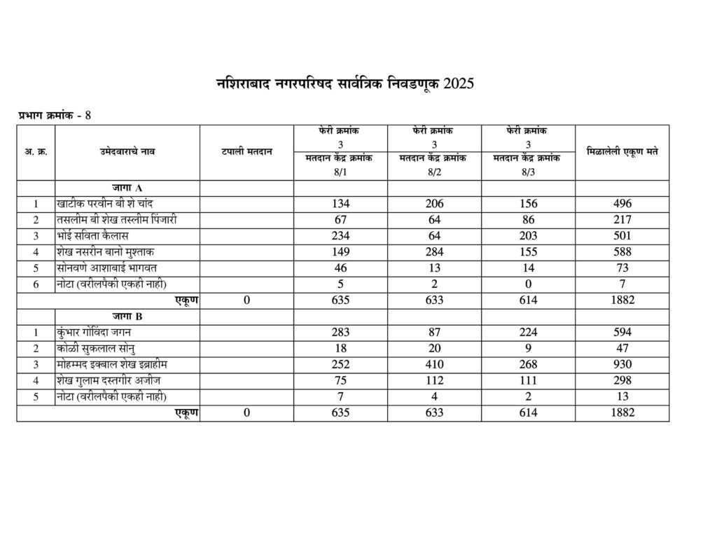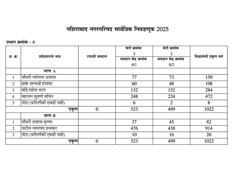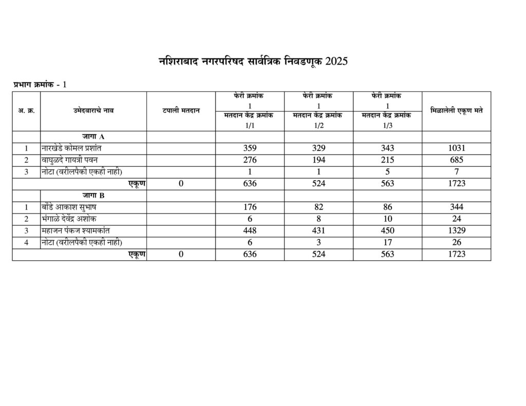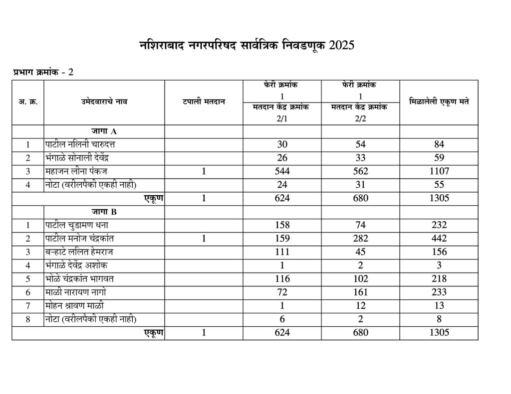 नशिराबाद नगरपरिषद नगरसेवक पदासाठीची मतमोजणी प्रभागानुसार:-