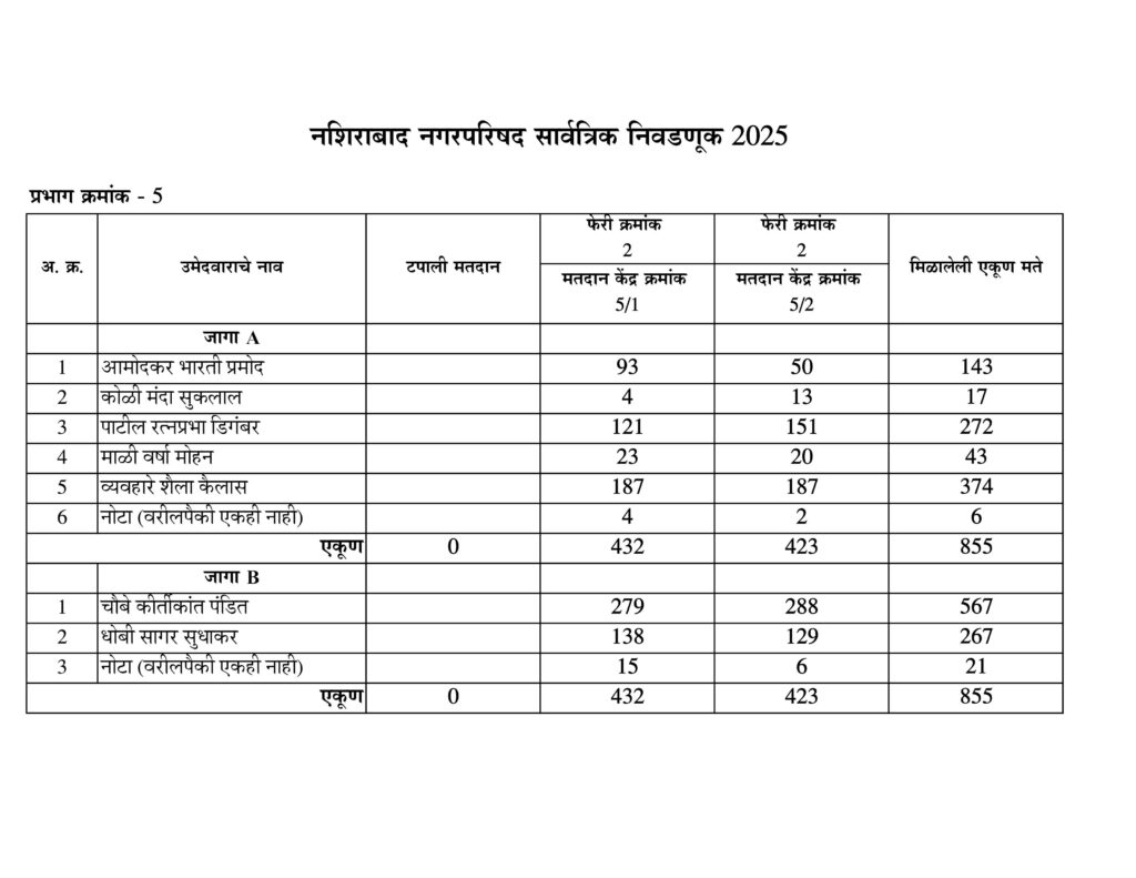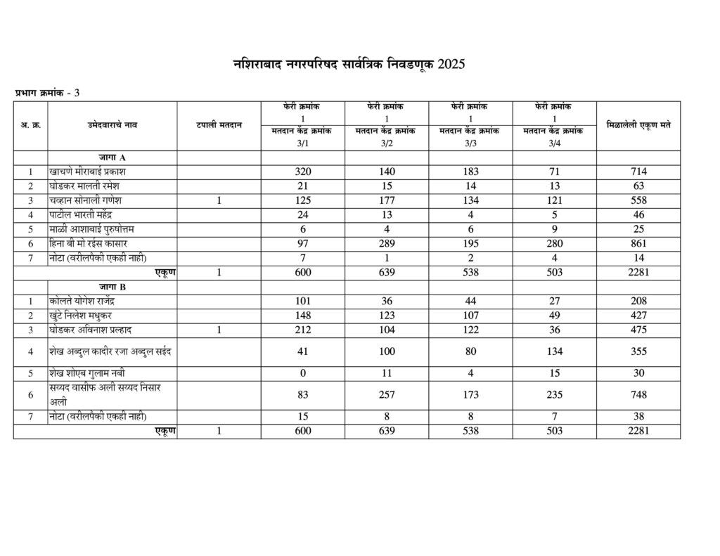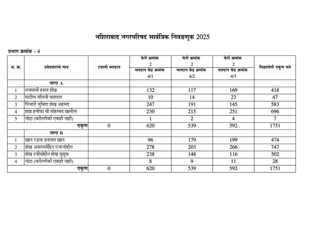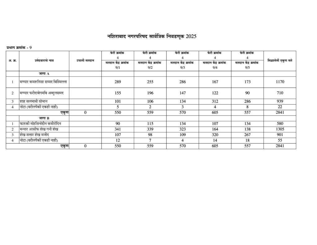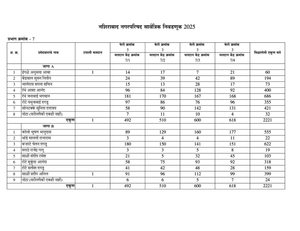 नशिराबाद नगरपरिषद नगरसेवक पदासाठीची मतमोजणी प्रभागानुसार:-