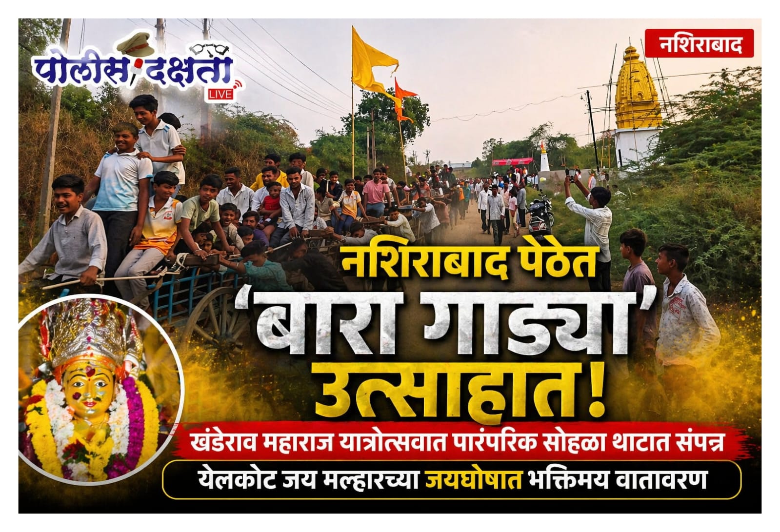 नशिराबाद | प्रतिनिधी | पोलीस दक्षता लाईव्ह :- नशिराबाद येथील पेठ परिसरात श्री खंडेराव महाराज यात्रोत्सवानिमित्त साजरा होणारा पारंपरिक ‘बारा गाड्या’ सोहळा यंदा मोठ्या उत्साहात पार पडला. काही वर्षांपूर्वी विविध कारणांमुळे खंडित झालेली ही परंपरा गेल्या चार ते पाच वर्षांपासून पुन्हा सुरू करण्यात आली असून, यंदाही भाविकांच्या उत्स्फूर्त सहभागाने कार्यक्रमाला भव्य स्वरूप प्राप्त झाले.