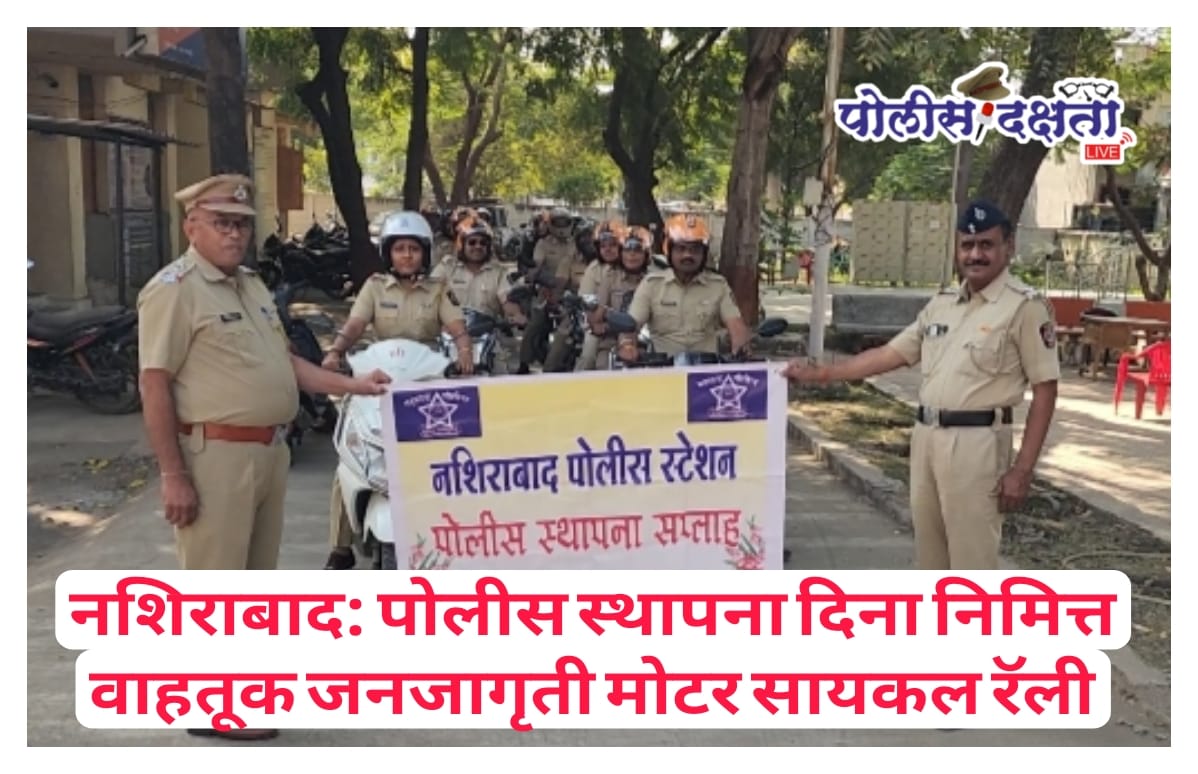 नशिराबाद | प्रतिनिधी | पोलीस दक्षता लाईव्ह :- पोलीस स्थापना दिनानिमित्त आज गुरुवार दि. ८ जानेवारी २०२६ रोजी नशिराबाद पोलीस ठाण्याच्या वतीने वाहतूक नियमांबाबत जनजागृती करण्यासाठी भव्य मोटारसायकल रॅलीचे आयोजन करण्यात आले. सहाय्यक पोलीस निरीक्षक योगिता नारखेडे यांच्या नेतृत्वाखाली ही रॅली सकाळी नशिराबाद पोलीस ठाण्यापासून प्रारंभ झाली. रॅली नशिराबाद बसस्थानक, शिवाजी महाराज चौक, ग्रामपंचायत चौक, इंदिरा चौक, आठवडे बाजार, होळी मैदान, स्वातंत्र्य चौक व साथी बाजार या मार्गाने मार्गक्रमण करत पुन्हा नशिराबाद पोलीस ठाण्यात समारोप झाली. या दरम्यान वाहतूक नियमांचे पालन, हेल्मेट वापर, वेगमर्यादा, मोबाईलचा वापर टाळणे आदी बाबींबाबत नागरिकांमध्ये जनजागृती करण्यात आली.