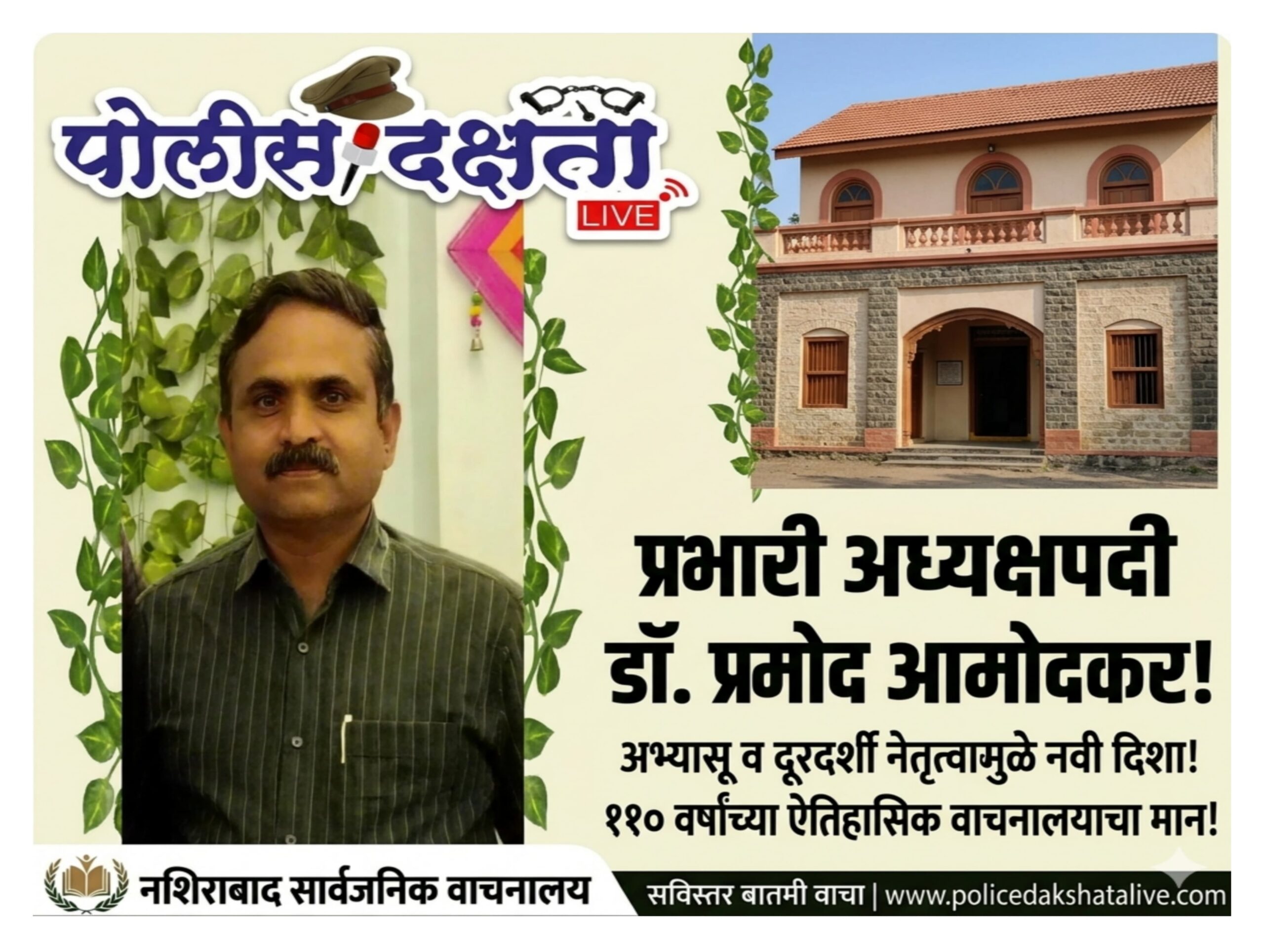 नशिराबाद | प्रतिनिधी | पोलीस दक्षता लाईव्ह :- नशिराबाद येथील ऐतिहासिक आणि प्रतिष्ठित सार्वजनिक वाचनालयाने आपल्या स्थापनेच्या 110 व्या वर्षात पदार्पण केले असून, या औचित्याने वाचनालयाच्या प्रभारी अध्यक्षपदी डॉ. प्रमोद पितांबर आमोदकर यांची एकमताने निवड करण्यात आली आहे. अलीकडेच पार पडलेल्या बैठकीत ही निवड प्रक्रिया पूर्ण झाली.डॉ. आमोदकर यांची अभ्यासू वृत्ती आणि दूरदृष्टी लक्षात घेता त्यांच्या नेतृत्वामुळे वाचनालयाच्या कामकाजात सकारात्मक बदल होऊन नव्या उपक्रमांना चालना मिळेल, असा विश्वास सदस्यांनी व्यक्त केला.