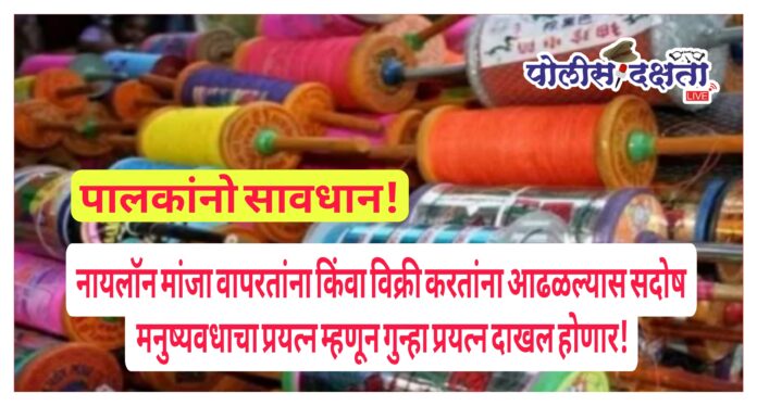 जळगाव | प्रतिनिधी | पोलीस दक्षता लाईव्ह :- आगामी मकर संक्रांतीच्या पार्श्वभूमीवर जळगाव जिल्हा पोलीस दलाने नायलॉन अथवा सिंथेटिक मांजा विक्री व वापराविरोधात कठोर पावले उचलली आहेत. पोलीस अधीक्षक डॉ. महेश्वर रेड्डी यांनी आदेश जारी करत यावर्षी केवळ जप्तीपुरती मर्यादित न राहता, भारतीय न्याय संहिता (BNS) २०२३ च्या कलम ११० अन्वये संबंधितांवर थेट ‘सदोष मनुष्यवधाचा प्रयत्न’ (Attempt to Culpable Homicide) हा गंभीर, अजामीनपात्र गुन्हा दाखल करण्याचे निर्देश दिले आहेत. या गुन्ह्यात दोषी आढळल्यास १० वर्षांपर्यंत शिक्षा होऊ शकते. नायलॉन मांजा मानवी जीव व पशुपक्ष्यांस अत्यंत घातक असून गळा कापल्याने दुचाकीस्वार व नागरिकांचे बळी गेल्याच्या घटना यापूर्वी घडल्या आहेत. विक्रेत्यांना या धोक्याची पूर्ण जाणीव असूनही नफ्यासाठी विक्री केल्यास, हे कृत्य नवीन कायद्यानुसार थेट ‘सदोष मनुष्यवधाचा प्रयत्न’ या व्याख्येत बसते, असे पोलीस प्रशासनाने स्पष्ट केले आहे.