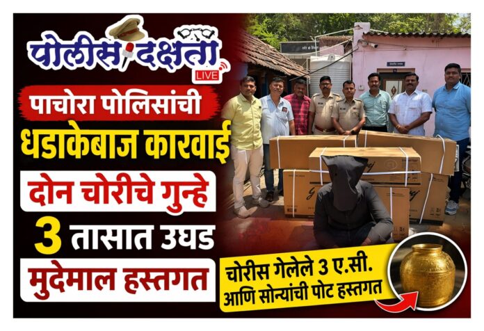 पाचोरा | प्रतिनिधी | पोलीस दक्षता लाईव्ह :- पाचोरा पोलीस स्टेशनच्या गुन्हे शोध पथकाने तत्परता दाखवत दोन चोरीचे गुन्हे अवघ्या तीन तासांत उघडकीस आणत चोरीस गेलेला संपूर्ण मुद्देमाल हस्तगत केला आहे. या कारवाईमुळे परिसरात पोलिसांच्या कार्यक्षमतेचे कौतुक होत आहे.याबाबत अधिक माहिती अशी की, नय्युम जहांगिर देशमुख (रा. आक्सानगर, जारगाव ता. पाचोरा) यांच्या इलेक्ट्रिक दुकानाच्या गोडाऊनमधून ९४,५०० रुपये किंमतीचे गोदरेज कंपनीचे तीन ए.सी. अज्ञात चोरट्यांनी १ एप्रिल ते १४ एप्रिल दरम्यान चोरून नेले होते. याप्रकरणी पाचोरा पोलीस स्टेशनला गुन्हा दाखल करण्यात आला.
