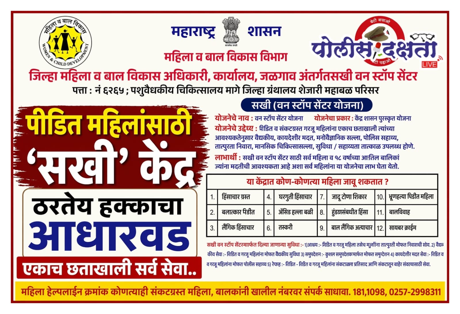 जळगाव | प्रतिनिधी | पोलीस दक्षता लाईव्ह :- महिला व बाल विकास विभागाच्या माध्यमातून राबविण्यात येणारी ‘सखी (वन स्टॉप सेंटर)’ योजना पीडित व संकटग्रस्त महिलांसाठी हक्काचा आधारवड ठरत आहे. एकाच छताखाली विविध अत्यावश्यक सेवा उपलब्ध करून देत या केंद्रामार्फत महिलांना तातडीची आणि सर्वंकष मदत दिली जात आहे.जिल्हा महिला व बाल विकास अधिकारी कार्यालयांतर्गत कार्यरत असलेल्या या केंद्रात हिंसाचारग्रस्त, बलात्कार पीडित, लैंगिक अत्याचारग्रस्त, घरगुती हिंसाचार पीडित, ॲसिड हल्ल्यातील बळी, तस्करीच्या घटनांतील पीडित, जादूटोणा प्रकरणातील महिला, हुंडाबळी प्रकरणे, बाल लैंगिक अत्याचारग्रस्त, भ्रूणहत्या पीडित महिला, बालविवाहातील पीडित तसेच सायबर गुन्ह्यांतील महिलांना मदत केली जाते.