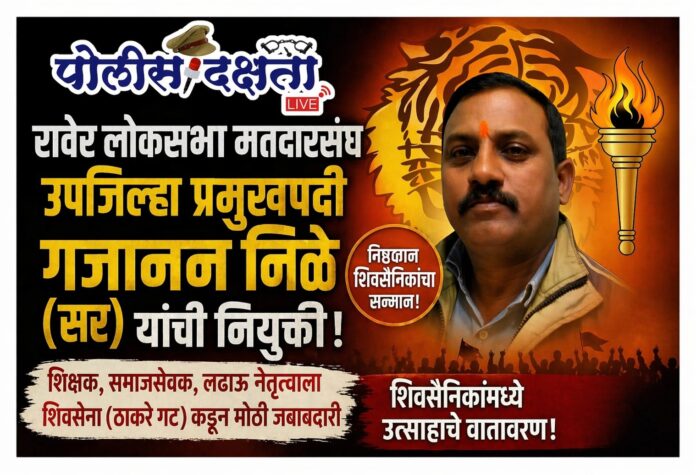 रावेर | प्रतिनिधी | पोलीस दक्षता लाईव्ह :- शिवसेना (उद्धव बाळासाहेब ठाकरे) पक्षाच्या वतीने रावेर विधानसभा मतदारसंघासाठी उपजिल्हाप्रमुखपदी गजानन निळे (सर) यांची नियुक्ती जाहीर करण्यात आली आहे. पक्षप्रमुख उद्धव ठाकरे यांच्या आदेशानुसार झालेल्या या नियुक्तीमुळे स्थानिक शिवसैनिकांमध्ये समाधान व उत्साहाचे वातावरण निर्माण झाले आहे.गेल्या अनेक दशकांपासून पक्षाशी निष्ठावान राहून कार्य करणाऱ्या निळे यांना या पदाच्या माध्यमातून नेतृत्वाची संधी मिळाल्याची भावना कार्यकर्त्यांकडून व्यक्त होत आहे. १९८८ पासून सक्रिय असलेले निळे यांनी संघटनात्मक पातळीवर सातत्याने काम करत पक्षवृद्धीत महत्त्वाची भूमिका बजावली आहे.