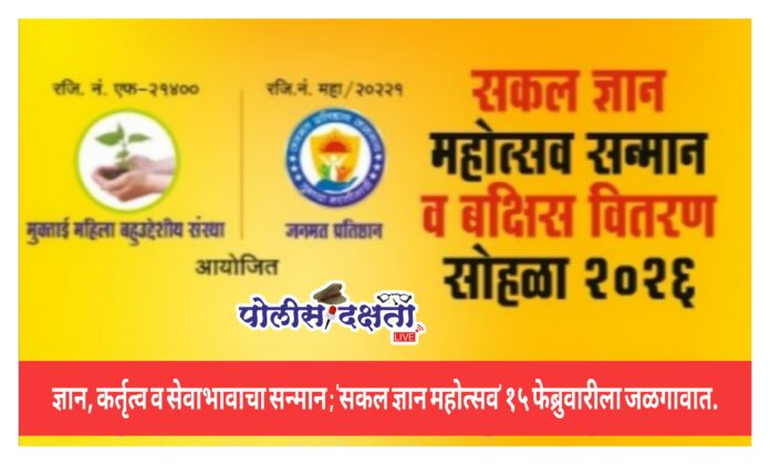 जळगाव | प्रतिनिधी | पोलीस दक्षात लाईव्ह :- समाजातील शिक्षण, पत्रकारिता, समाजसेवा, आरोग्य, शेती, क्रीडा व विविध क्षेत्रांत उल्लेखनीय योगदान देणाऱ्या कर्तृत्ववान व्यक्तींचा गौरव करणारा ‘सकल ज्ञान महोत्सव – सन्मान व बक्षीस वितरण सोहळा २०२६’ रविवार, दि. १५ फेब्रुवारी २०२६ रोजी सकाळी ९ वाजता अल्पबचत भवन, जिल्हाधिकारी कार्यालय परिसर, जळगाव येथे उत्साहात संपन्न होणार आहे. हा उपक्रम यंदा पाचव्या वर्षात पदार्पण करीत असून ज्ञानाचा सन्मान व सेवाभावाचा गौरव हा त्यामागील प्रमुख उद्देश आहे.