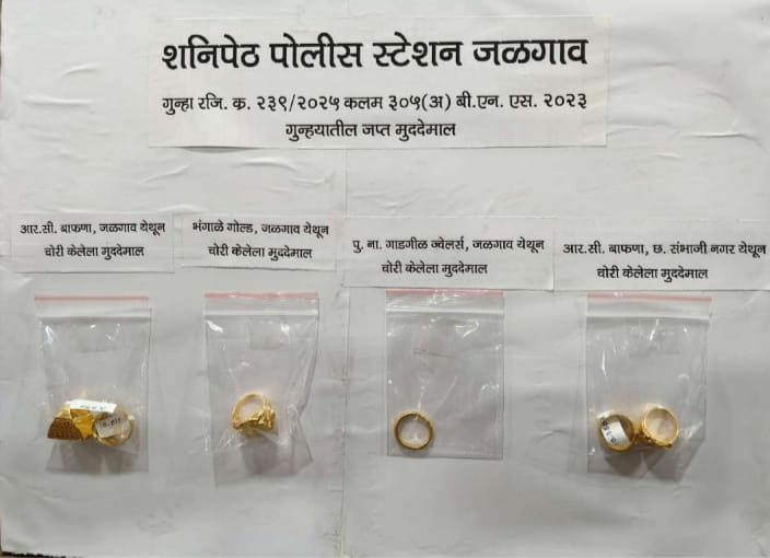 जळगाव | प्रतिनिधी | पोलीस दक्षता लाईव्ह :- शनिपेठ पोलिसांनी सोन्याच्या अंगठ्या बदलून नकली अंगठ्या ठेवण्याच्या सराईत पद्धतीने गुन्हे करणाऱ्या महिलेला अटक करून 6 लाख 60 हजार रुपये किमतीच्या अंगठ्या जप्त करत मोठे यश मिळवले आहे. जळगाव, संभाजीनगर ते उत्तरप्रदेशपर्यंत फिरत गुन्हे करणारी ही महिला पोलिसांनी बरेली (उत्तरप्रदेश) येथून ताब्यात घेतली.दिनांक 04 नोव्हेंबर 2025 रोजी शनिपेठ पोलिस स्टेशनमध्ये दाखल गुन्ह्यात 27 ऑक्टोबर रोजी RC बाफना ज्वेलर्स, सुभाष चौक तसेच ‘भंगाळे गोल्ड’, राजकमल टॉकीज परिसरात हातचलाखीच्या पद्धतीने तीन सोन्याच्या अंगठ्या चोरी झाल्याचे CCTV फुटेजमध्ये समोर आले होते. फिर्यादी गणेश राजाराम काळे (रा. अयोध्या नगर) यांनी दिलेल्या तक्रारीवरून गुन्हा नोंदविण्यात आला होता.सदरच अनोळखी महिलेनं जिल्हापेठ पोलीस ठाण्याच्या हद्दीत 1 नोव्हेंबर रोजी गाळगीळ अँड सन्स ज्वेलर्स येथे याच पद्धतीने सोन्याच्या अंगठ्या बदलून चोरी केली असून त्या संदर्भात गुन्हा दाखल आहे. तसेच संभाजीनगर येथील जिन्सी पोलीस स्टेशन क्षेत्रातील RC बाफना ज्वेलर्स दुकानातसुद्धा तिने तसाच गुन्हा केल्याने 11 नोव्हेंबर रोजी गुन्हा दाखल आहे.