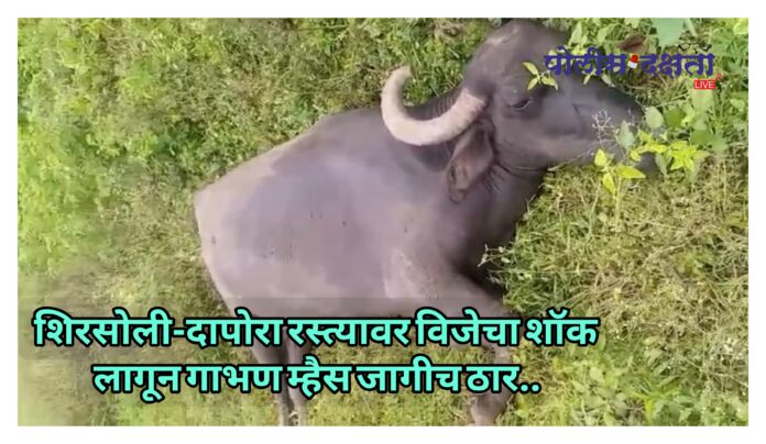 जळगाव | प्रतिनिधी | पोलीस दक्षता लाईव्ह :- तालुक्यातील शिरसोली ते दापोरा रस्त्यावर शुक्रवारी सकाळी घडलेल्या दुर्दैवी प्रकारात विजेच्या शॉकने एका गाभण म्हशीचा जागीच मृत्यू झाला. यामुळे संबंधित पशुपालकाचे जवळपास ९० हजार रुपयांचे आर्थिक नुकसान झाले असून परिसरात खळबळ उडाली आहे.