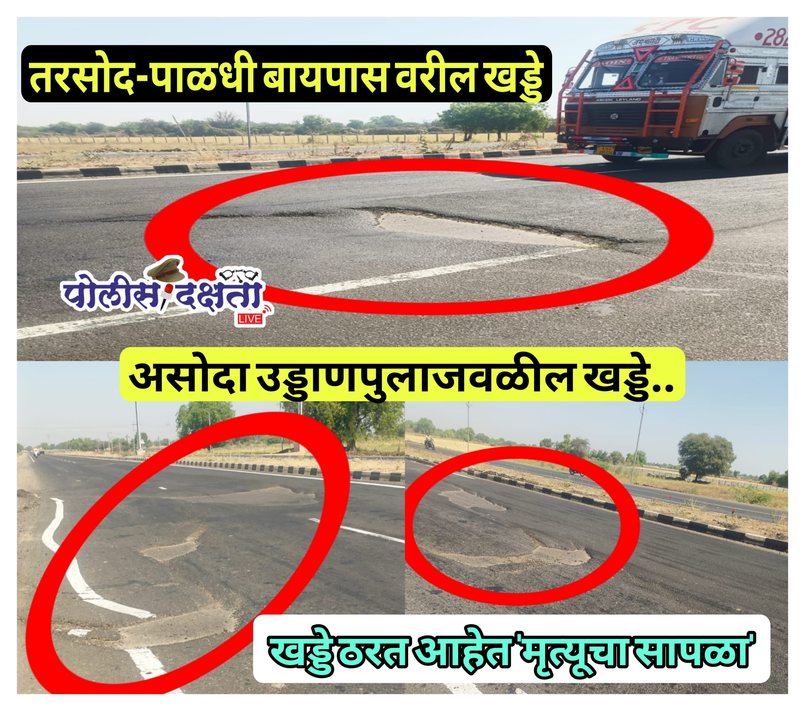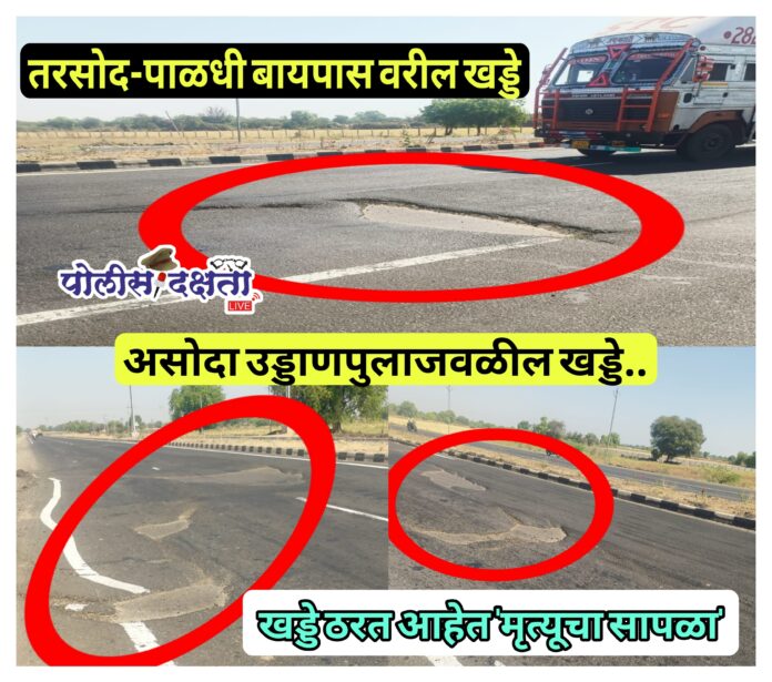 जळगाव | प्रतिनिधी | पोलीस दक्षता लाईव्ह :- तरसोद ते पाळधी या बायपास महामार्गाची अवस्था सध्या अत्यंत दयनीय बनली असून हा मार्ग वाहनधारकांसाठी अक्षरशः जीवघेणा ठरत आहे. तरसोद ते पाळधी पर्यंत 8 ते 10 ठिकाणी रोडच्या आधोमध मोठमोठे खड्डे पडल्याने अपघातांची मालिका वाढत आहे. विशेषतः असोदा उड्डाणपूल उतरल्यानंतर लगेचच मोठमोठ्या खड्ड्यांचा विळखा सुरू होत असल्याने वेगात असलेल्या वाहनचालकांचा अंदाज चुकत आहे. परिणामी, या परिसरात अपघातांचे प्रमाण लक्षणीयरीत्या वाढले आहे.असोदा उड्डाणपुलावरून उतरताना वाहनांचा वेग अधिक असतो. मात्र, पूल संपताच समोर एक ते एक फूट खोल खड्डे आ वासून उभे आहेत. अचानक समोर आलेल्या या खड्ड्यांमुळे चालकांना जोरात ब्रेक दाबावे लागतात. अशा वेळी पाठीमागून येणाऱ्या वाहनांच्या धडकण्याचा किंवा खडीवरून वाहन घसरून अपघात होण्याचा धोका निर्माण झाला आहे. गेल्या काही दिवसांत अनेक दुचाकीस्वार येथे घसरून गंभीर जखमी झाल्याच्या घटना घडल्या आहेत.