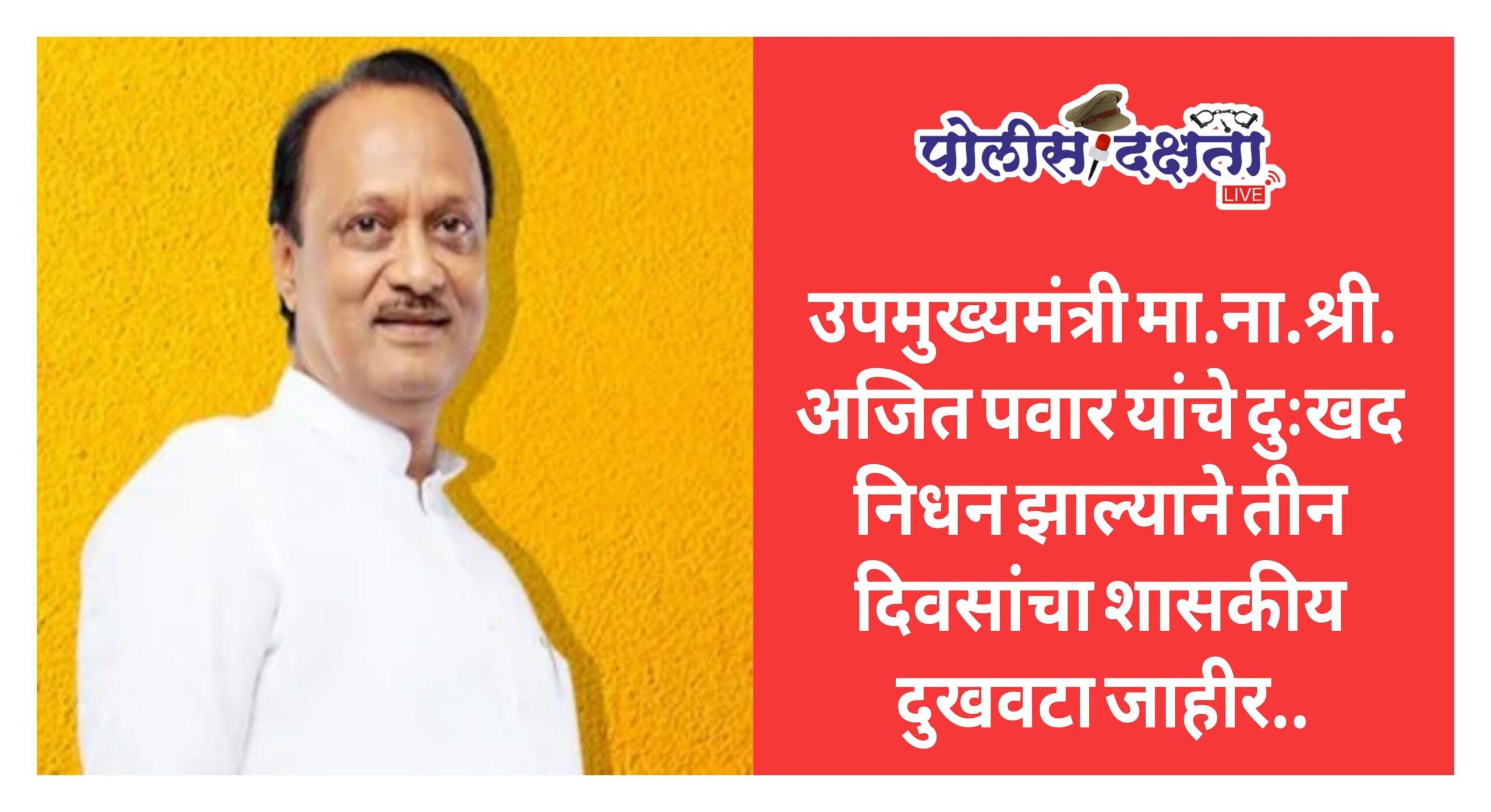 जळगाव | प्रतिनिधी | पोलीस दक्षता लाईव्ह :- महाराष्ट्र राज्याचे उपमुख्यमंत्री मा.ना. श्री. अजित पवार यांचे दिनांक 28 जानेवारी 2026 रोजी दुःखद निधन झाल्याने राज्यात शोककळा पसरली आहे. त्यांच्या निधनाच्या पार्श्वभूमीवर राज्य शासनाने दिनांक 28 जानेवारी 2026 ते 30 जानेवारी 2026 या कालावधीत तीन दिवसांचा शासकीय दुखवटा जाहीर केला आहे.सामान्य प्रशासन विभाग, मंत्रालय, मुंबई यांच्याकडील वायरलेस संदेश क्र. DIP-2026/CR-20/PROTO-1 दिनांक 28 जानेवारी 2026 नुसार सदर निर्णय घेण्यात आला असून, दिनांक 28 जानेवारी 2026 रोजी सर्व राज्य शासकीय कार्यालये बंद ठेवण्याचे आदेश देण्यात आले आहेत.या कालावधीत शासकीय इमारतींवरील राष्ट्रीय ध्वज अर्ध्यावर ठेवण्यात येणार असून कोणतेही शासकीय समारंभ, मनोरंजनाचे कार्यक्रम किंवा उत्सव साजरे करण्यात येणार नाहीत. सदर आदेशानुसार जिल्ह्यातील सर्व शासकीय, निमशासकीय कार्यालये, स्थानिक स्वराज्य संस्था, सार्वजनिक उपक्रम तसेच संबंधित विभागांनी शासनाच्या सूचनांनुसार आवश्यक ती कार्यवाही करावी, असे आवाहन प्रशासनामार्फत करण्यात आले आहे.