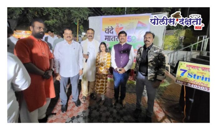 जळगाव | प्रतिनिधी | पोलीस दक्षता लाईव्ह :- राष्ट्रगीत ‘वंदे मातरम्’ या अमर देशभक्तीपर गीताला १५० वर्ष पूर्ण झाल्याच्या निमित्ताने भारतीय जनता पक्षातर्फे ७ नोव्हेंबर रोजी कालिंका माता मंदिर चौकात देशभक्तीपर गीतांचा भव्य व स्फूर्तीदायी कार्यक्रम आयोजित करण्यात आला. सुबोनियो परिवाराच्या सहकार्याने या कार्यक्रमाचे आयोजन करण्यात आले होते.संध्याकाळी सुरू झालेल्या या मैफिलीत तुषार वाघुळदे प्रेझेंट्स सुप्रसिद्ध 7 स्ट्रिंग्स ऑर्केस्ट्राच्या कलाकारांनी देशभक्तीपर गीतांनी वातावरण भारून टाकले. गायक नारायणभाई ओझा, नवगायिका दीक्षा, तुषार वाघुळदे आणि निलेश पाटील यांनी सादर केलेल्या गीतांना प्रेक्षकांकडून उत्स्फूर्त दाद मिळाली. उपस्थित रसिकांनी कलावंतांचे उभे राहून कौतुक केले.कार्यक्रमाच्या प्रारंभी भारतमातेची प्रतिमा पूजून राष्ट्रगीताला अभिवादन करण्यात आले. पूजन सोहळा आमदार सुरेश उर्फ राजू मामा भोळे आणि उद्योगपती व पर्यावरण प्रेमी सुबोध कुमार चौधरी यांच्या हस्ते संपन्न झाला. परिसरात आकर्षक रांगोळ्यांनी देशभक्तीचा भाव आणखी खुलवला.