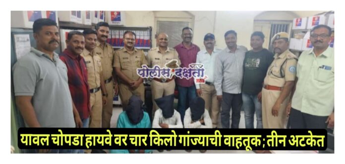 यावल | प्रतिनिधी | पोलीस दक्षता लाईव्ह :- यावल पोलीस स्टेशन हद्दीत गांजाची अवैध वाहतूक करताना पोलिसांनी केलेल्या धडक कारवाईत तिघा आरोपींना अटक करून चार किलो गांजा व एक स्प्लेंडर मोटारसायकल जप्त करण्यात आली आहे. ही कारवाई २५ जून रोजी गुप्त माहितीच्या आधारे यावल-चोपडा महामार्गावरील फॉरेस्ट कॉलनी परिसरात करण्यात आली. मा.पोलीस अधीक्षक डॉ. महेश्वर रेड्डी, अपर पोलीस अधीक्षक श्री. अशोक नखाते तसेच उपविभागीय पोलीस अधिकारी श्री. अनिल बडगुजर यांच्या मार्गदर्शनाखाली पो.नि. रंगनाथ धारबळे यांच्या नेतृत्वाखाली ही कारवाई करण्यात आली.